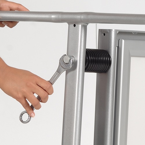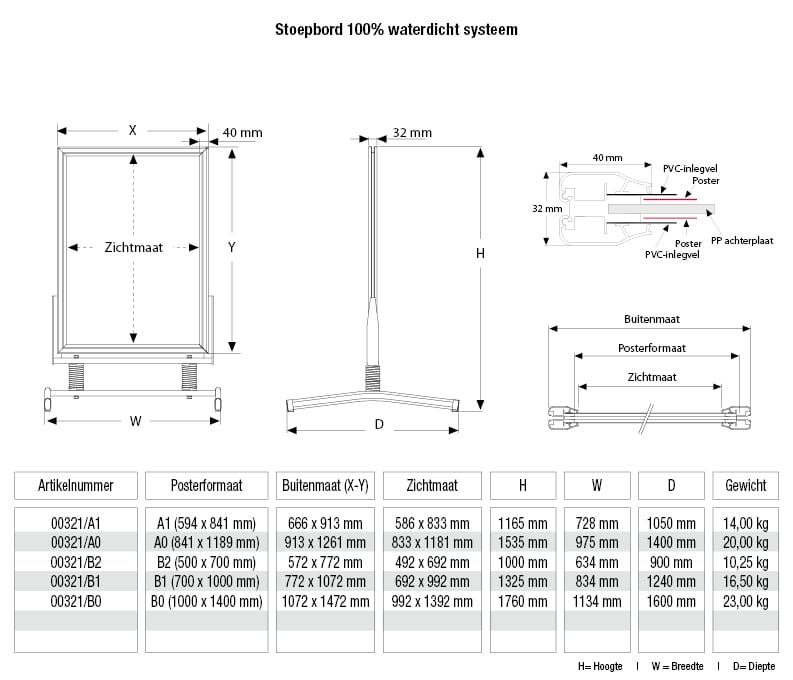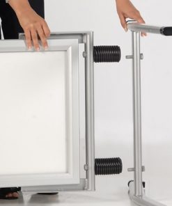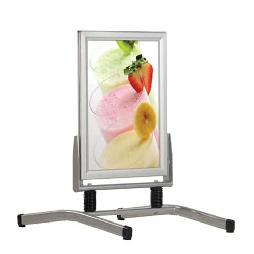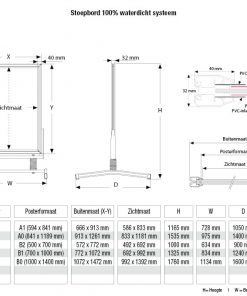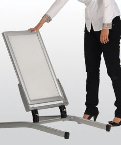 Stoepbord Windmaster 100cm breed – 140cm hoog. Het stoepbord is een 100% waterdicht systeem, dat zowel bestand is tegen wind als regen. Met zijn afgewerkte hoeken, twee stalen veren op statief en eenvoudig te openen kliklijst, is dit stoepbord een echte aanrader. Het stoepbord is in meerdere afmetingen verkrijgbaar en is uitgevoerd in zilver geanodiseerde aluminium. Hoge Europese kwaliteit!