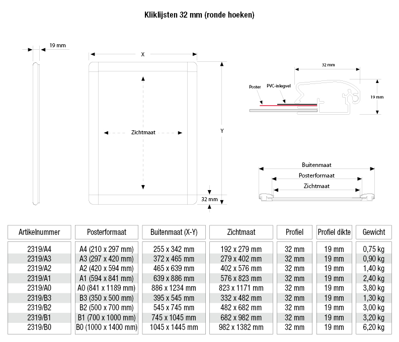 Kliklijst met ronde hoeken aluminium geanodiseerd. A3 formaat 32mm lijst. Hoge Europese kwaliteit!